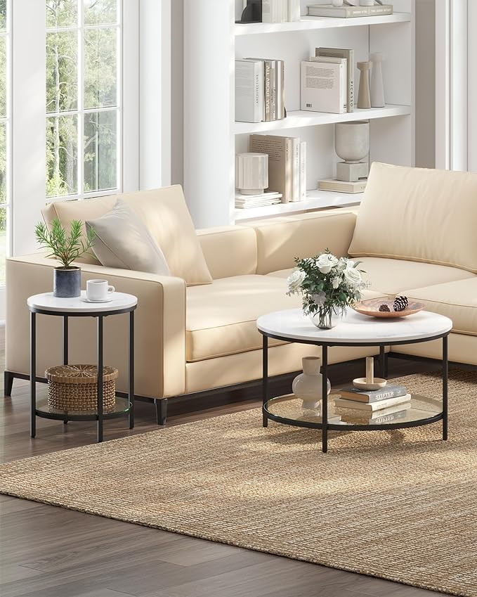 Bijzettafel Marmerlook - Nachtkastje met 2 niveaus - Gehard glas - Woonkamer - Slaapkamer