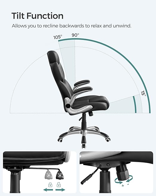 - Klaar met werken? Klap de armleuningen omhoog en schuif de stoel onder het bureau om ruimte te besparen.