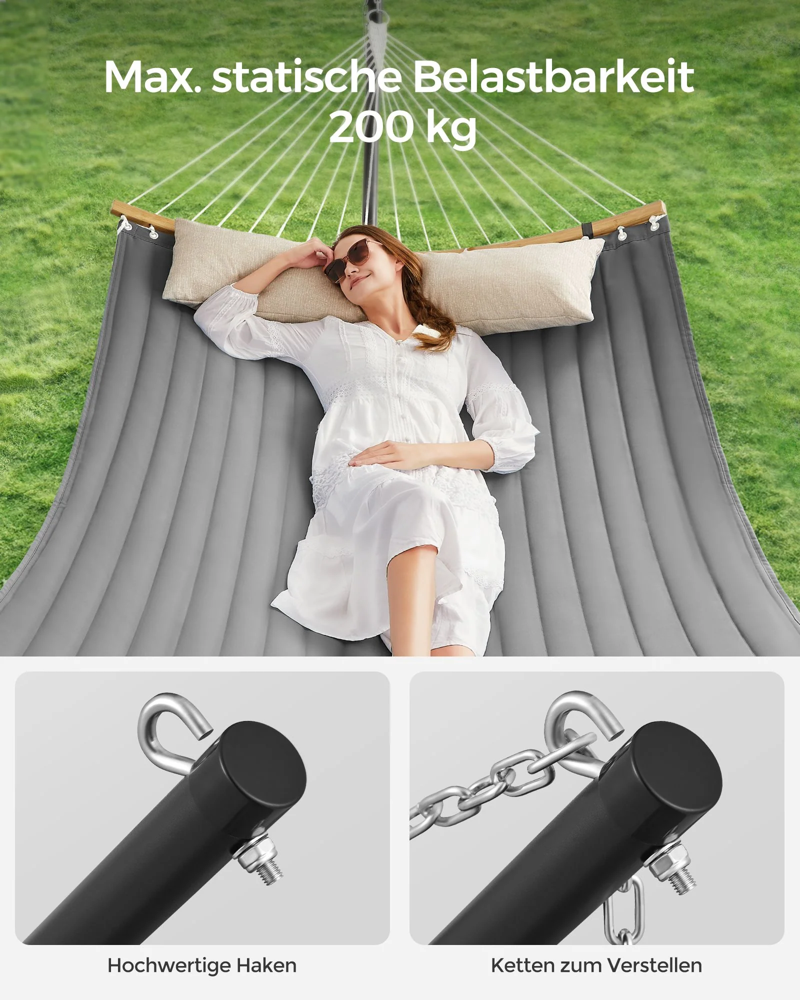 Gemaakt van hoogwaardig staal en polyester, is deze hangmat ontworpen om lang mee te gaan. Het metalen frame biedt stabiliteit en kan een maximale belasting van 200 kg aan, waardoor het geschikt is voor meerdere gebruikers.