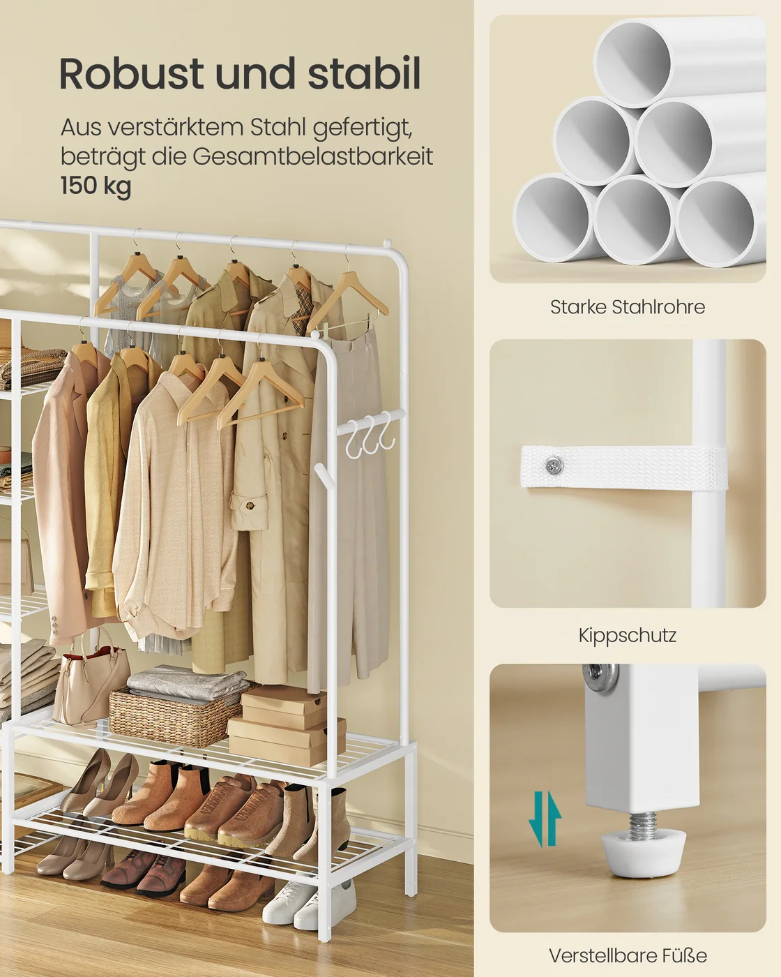 Met afmetingen van 45 x 115,8 x 172,8 cm is dit kledingrek ideaal voor kleinere ruimtes. Het biedt voldoende opbergruimte zonder te veel vloeroppervlak in beslag te nemen, waardoor het perfect is voor appartementen of kamers met beperkte ruimte.