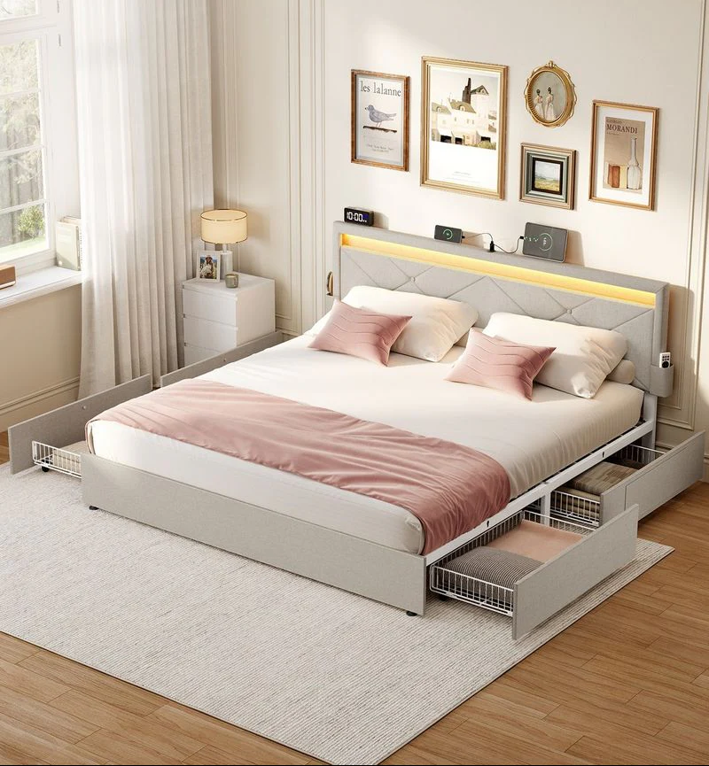 Dit bedframe biedt vier ruime lades voor kleding en accessoires, twee organizers voor boeken en twee zijvakken voor bril, afstandsbediening of kleine benodigdheden. Alles heeft zijn eigen plek – praktisch én stijlvol.