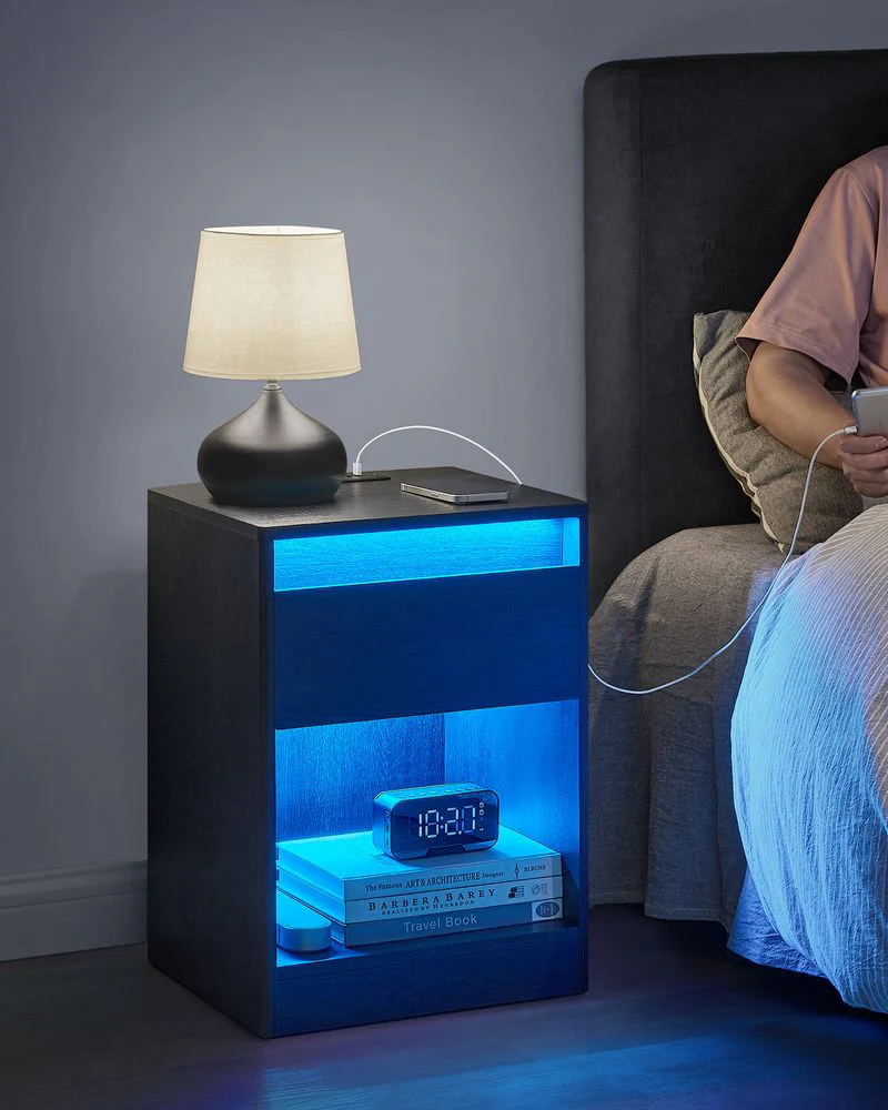 Deze stijlvolle nachtkast met ingebouwde LED-verlichting en stopcontacten is de ideale combinatie van functionaliteit en design.